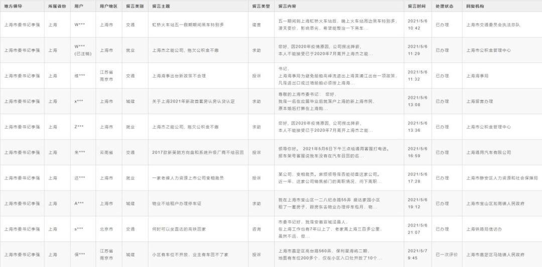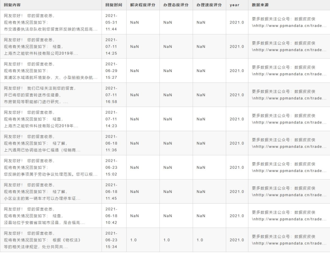 | 留言时间 | 处理状态 | 回复机构 | 回复内容 | 回复时间 | year | 数据来源 | |