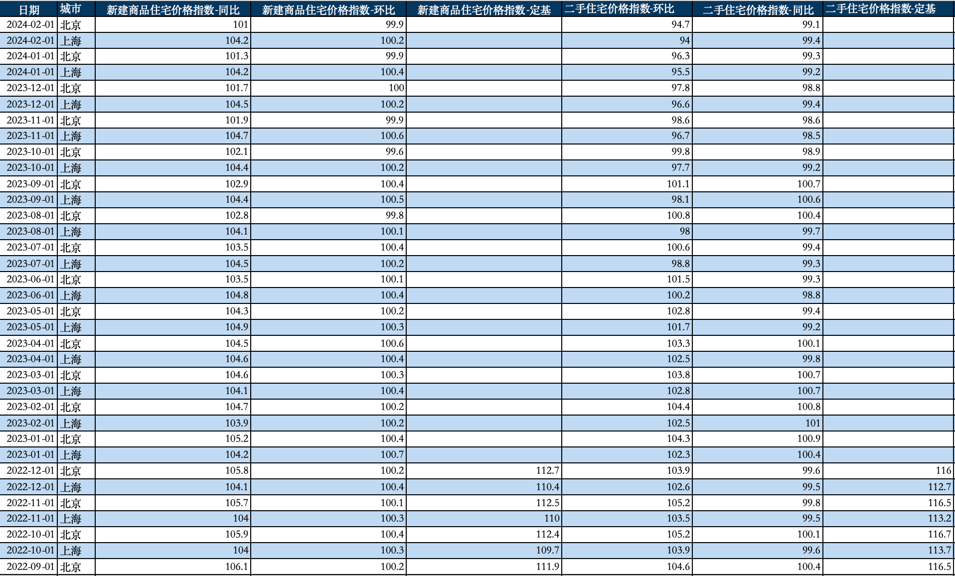 | 日期、城市 | 新建商品住宅价格指数-同比 |