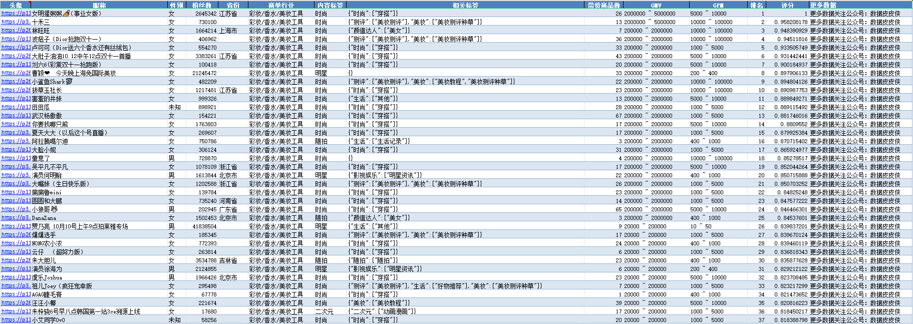 星图是由抖音建立的营销平台,旨在实现创作者商业生态的繁荣。巨量星图有超200万可接单创作者,超1500家入驻巨量星图的MCN机构、超1000家入驻巨量星图的服务商,累计190万品牌与客户。在这个平台上,公司可以访问所有抖音的网红,管理他们与网红签订的合同,审查与其网红策略相关的营销和销售数据,并向网红付款。星图平台上显示了每个网红的详细信息,如粉丝规模、历史销售业绩、收视率、推广产品类别和雇佣成本等等,为科研研究提供了可靠的数据。数据包含美妆、床上用品、大家电、个人护理、酒类、零食坚果特产、美容护肤、男鞋、男装、女鞋、女装、生活电器、手机、童装、箱包共15种品类的排名和销售情况,有日榜、月榜、周榜和总榜三种形式。
