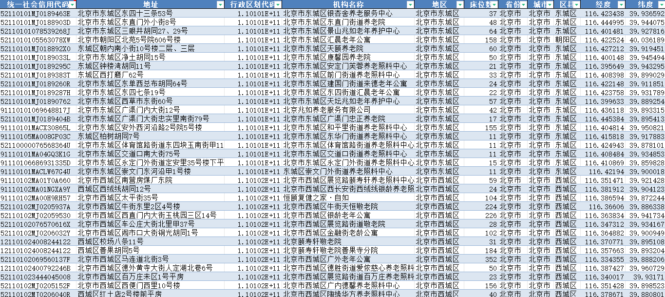 | 区域跨度 | 医疗卫生机构:省 养老机构信息:全国共41955条数据 |