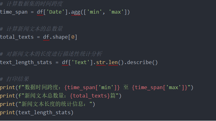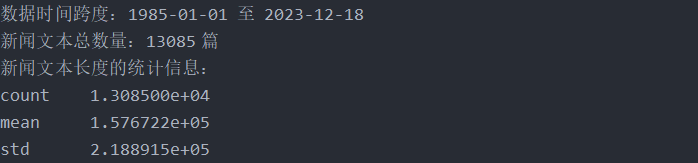 • 标准差:约218,891字,标准差较大,意味着新闻长度的分布非常广泛,既有非常短的新闻,也有长篇报道,体现了内容的多样性。
