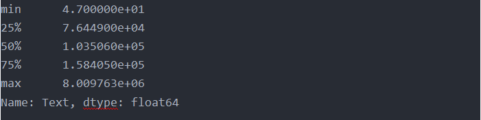 • 分位数:根据四分位数(25%, 50%, 75%)数据,我们可以看出超过一半的新闻文本长度在76,449至158,405字节之间,显示出一定的集中趋势,但同时也有极端值,如最小值(min)47字节和最大值(max)8,009,763字节,表明部分新闻或许仅为简讯,而某些新闻则可能是详细的专题报道或系列文章