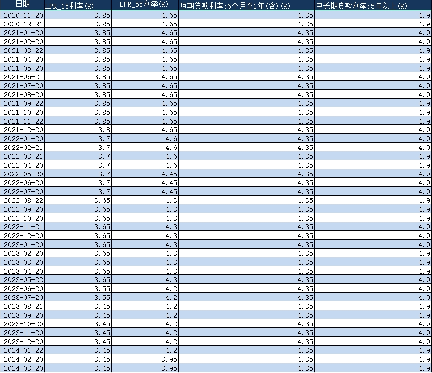 | LPR_1Y利率(%) | LPR_5Y利率(%) | 中长期贷款利率:5年以上(%) |