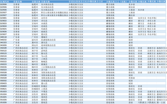 | 县级名称 | 官话区/汉语方言区/少数民族方言区 | 少数民族方言1 |